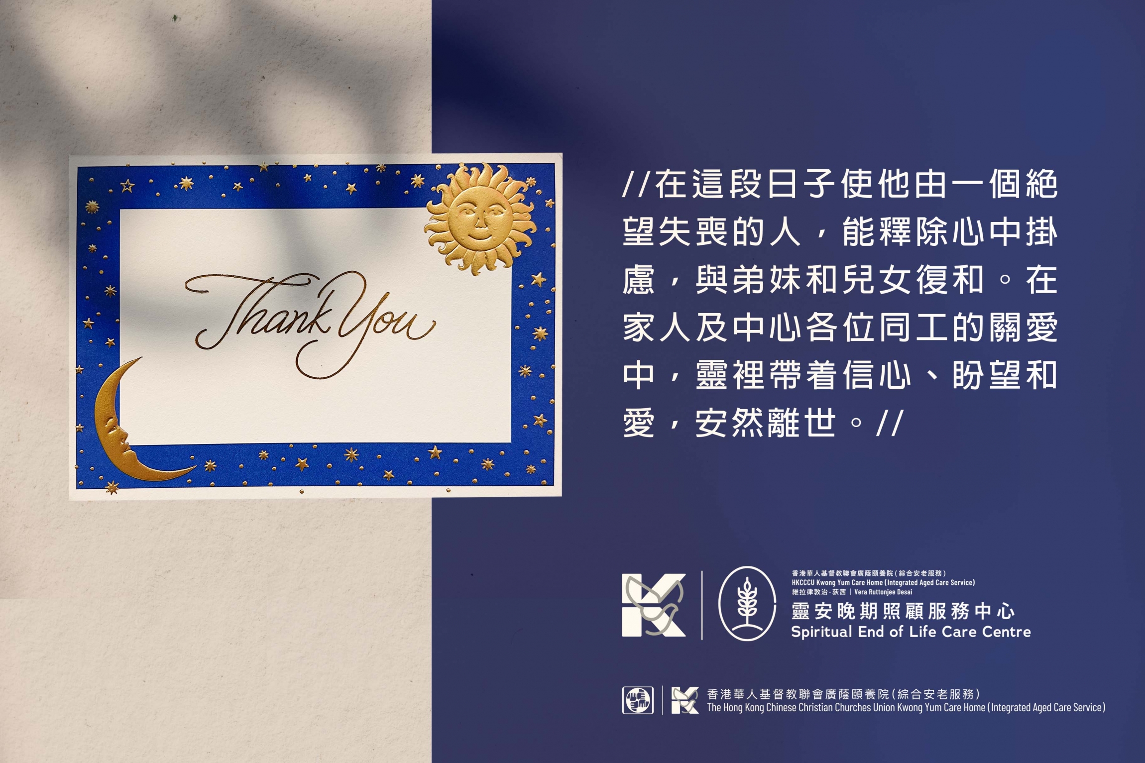 在這段日子使他由一個絕望失喪的人,能釋除心中掛慮,與弟妹和兒女復和。在家人及中心各位同工的關愛中,靈裡帶着信心、盼望和愛,安然離世。願你們的工作得上帝的讚許!